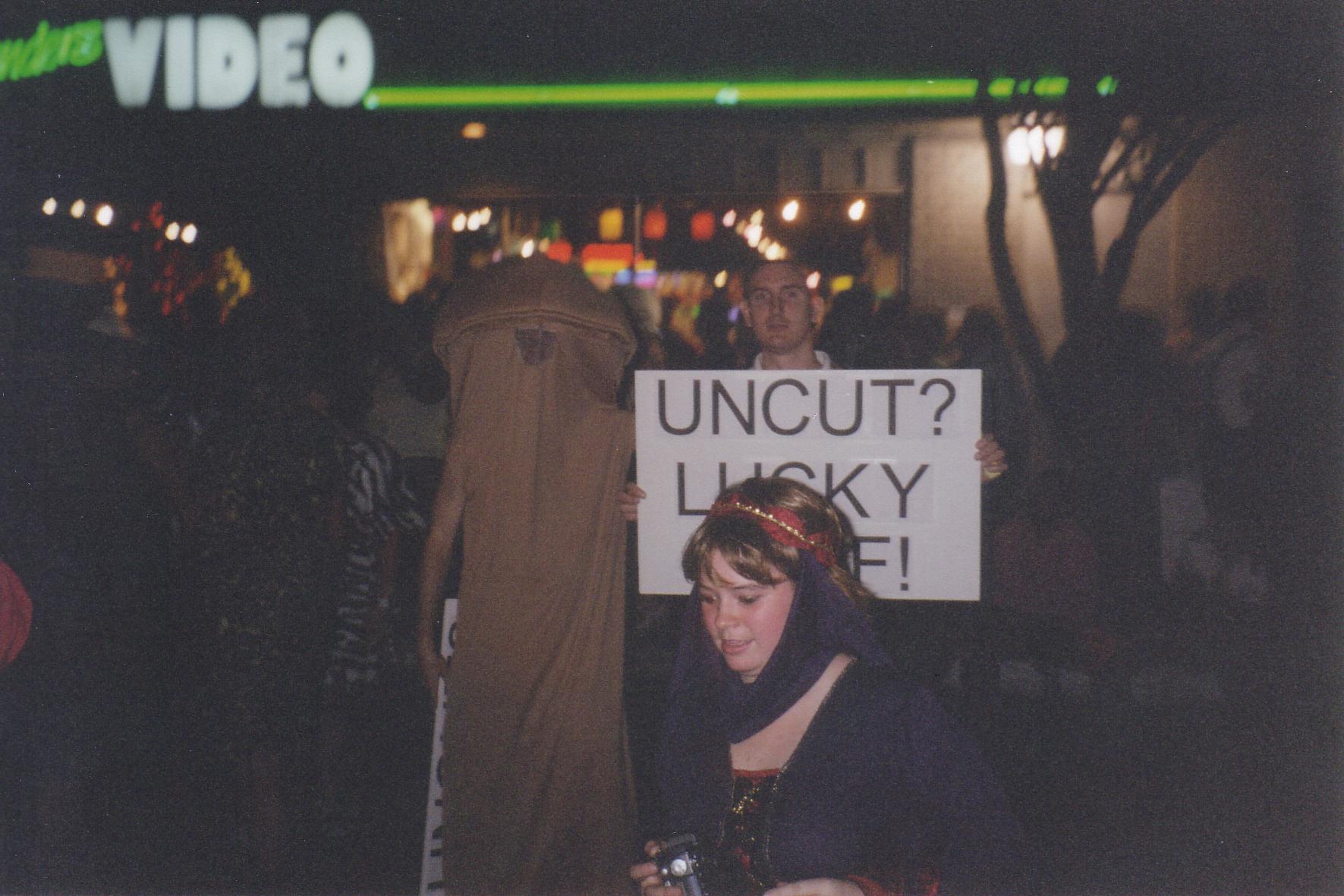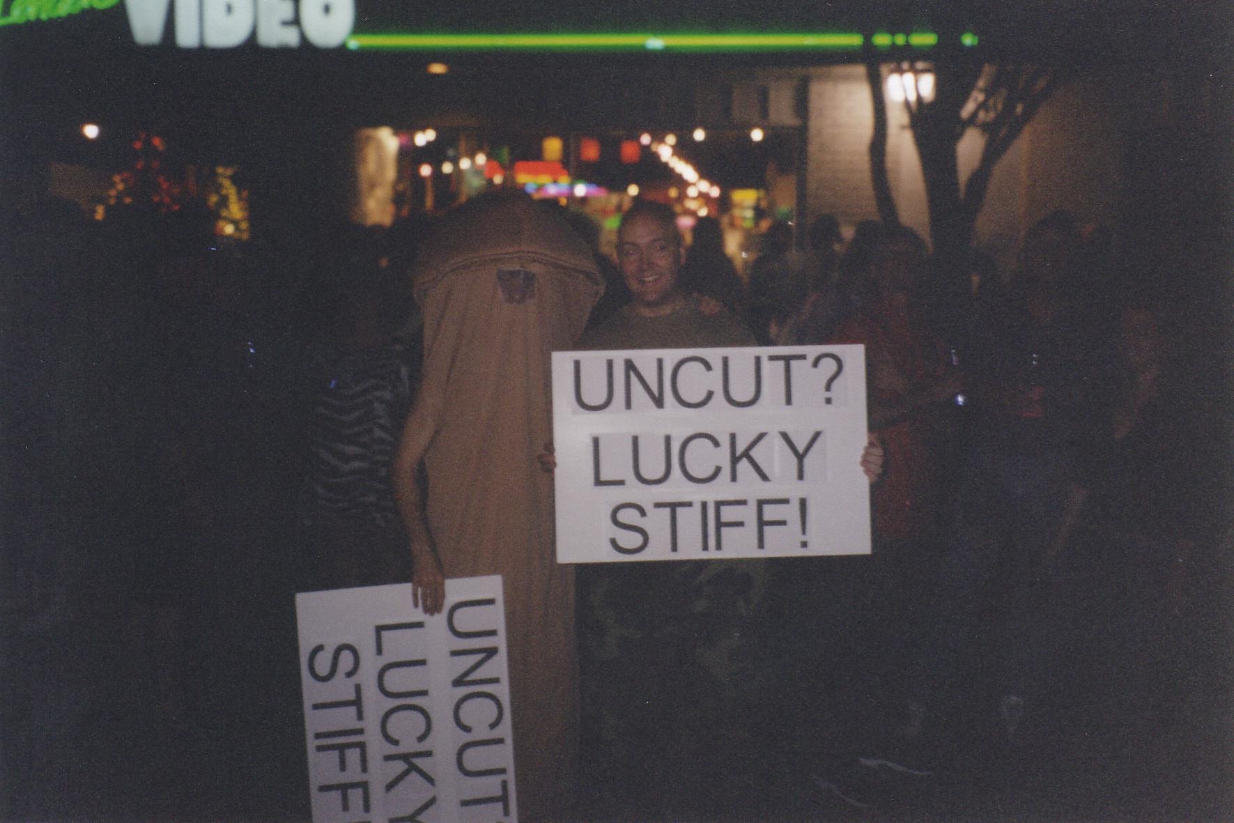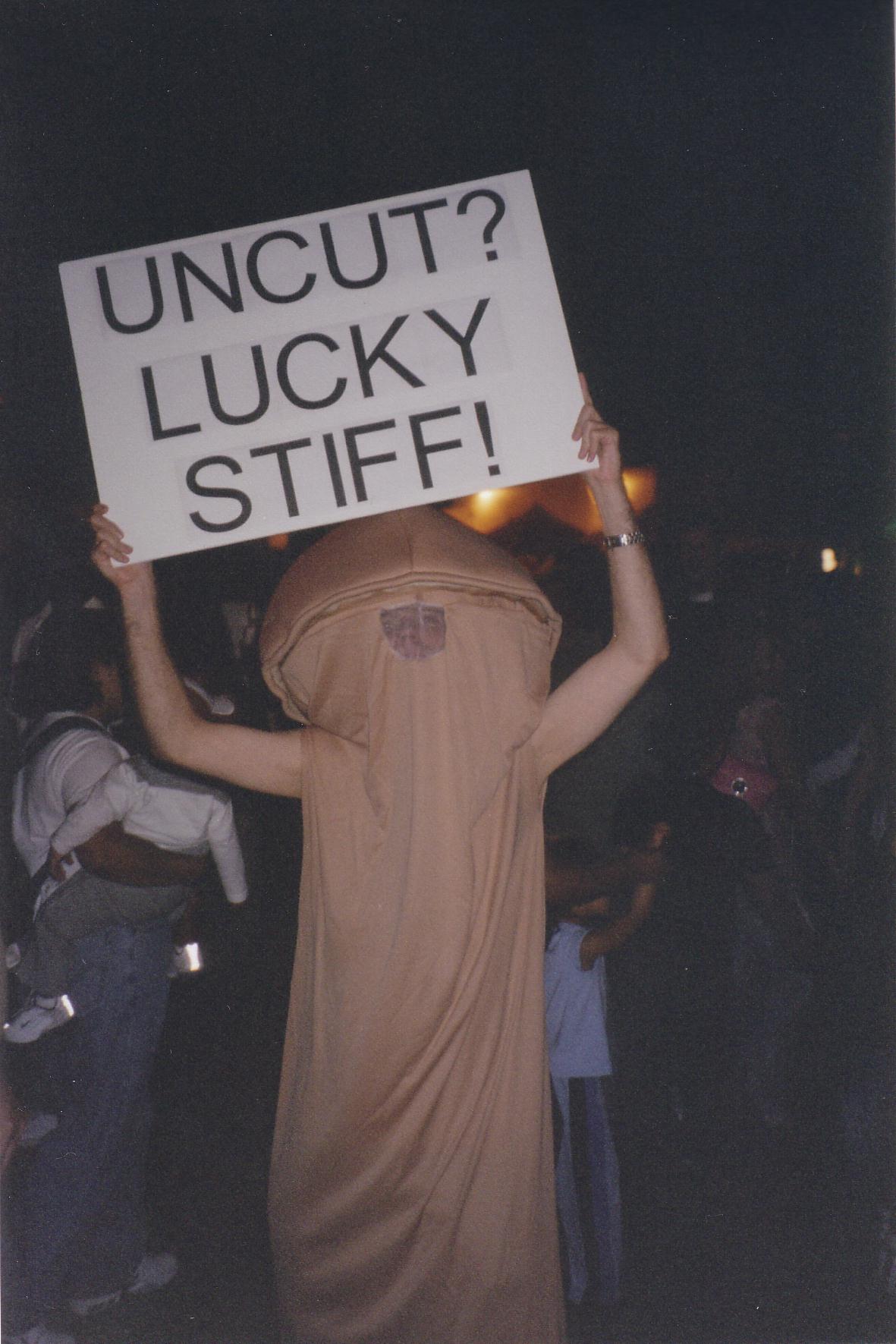 I did find out one very important thing. Dressing up in a penis costume holding a sign saying "Uncut? Lucky Stiff!" will attract some attention, but a dancing penis with a sign over one's head moving with the beat of the music will get you ten times as much attention. Note: Anyone, male or female, can wear one of these costumes. The only negative feedback I heard was from one couple saying the intact penis "wasn't kosher." Everybody else was accepting of our message or didn't bother arguing the point.